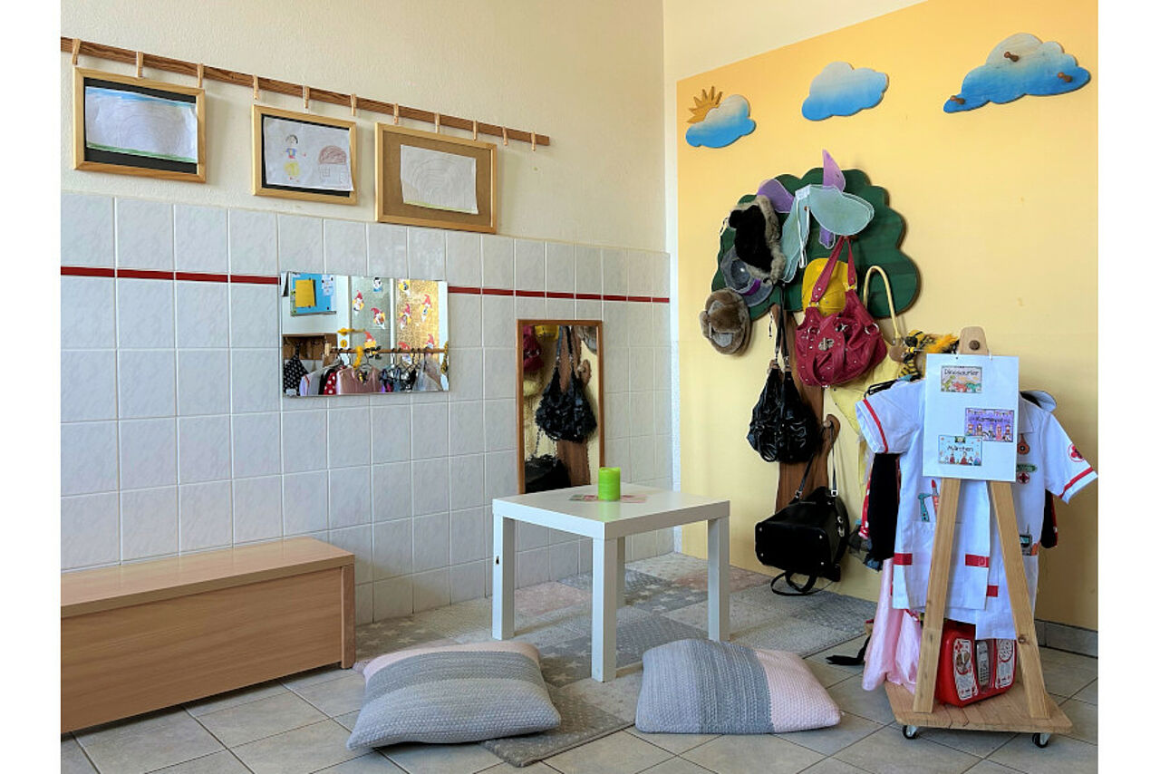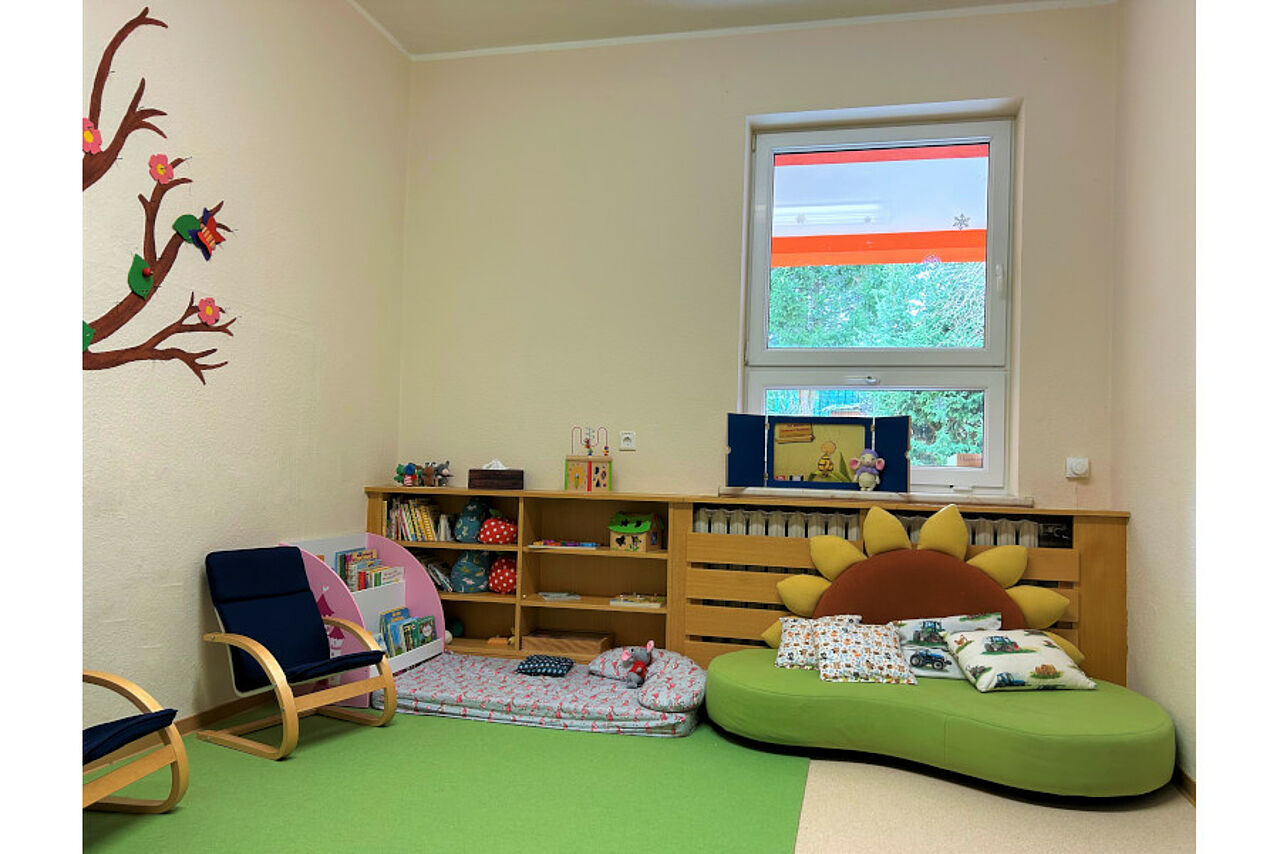 Im Krippenhaus gibt es pro Etage mehrere Gruppenräume, einen Schlafraum und einen Sanitärbereich. Außerdem stehen allen Kindern ein Snoezelraum und ein Kreativzimmer zur Verfügung.